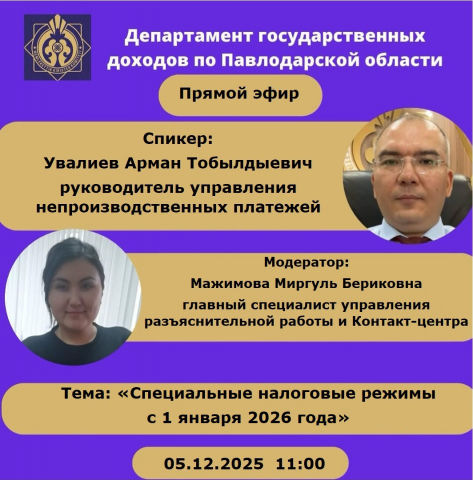 2025 жылғы 5 желтоқсанында сағат 11:00-де Департаменттің «Instagram» әлеуметтік желісіндегі парақшасында «2026 жылдың 1 қаңтарынан бастап арнаулы салық режимдері» тақырыбына тікелей эфир өтеді. Спикер ретінде өндірістік емес төлемдер басқармасының басшысы Арман Тобылдыұлы Увалиев сөз сөйлейді. Трансляцияны жіберіп алмау үшін Павлодар облысы бойынша мемлекеттік кірістер Департаментінің pavlodar_mkd Instagram парақшасына жазылыңыз.